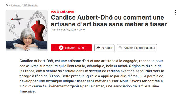 A la fois artiste textile et artisane d’art, Candice Aubert-Dhô développe sa vision du monde contemporain dans ses projets fait à la main. Elle développe ainsi un travail textile contemporain à la croisée de l’art, de l’artisanat et de l’architecture intérieure.