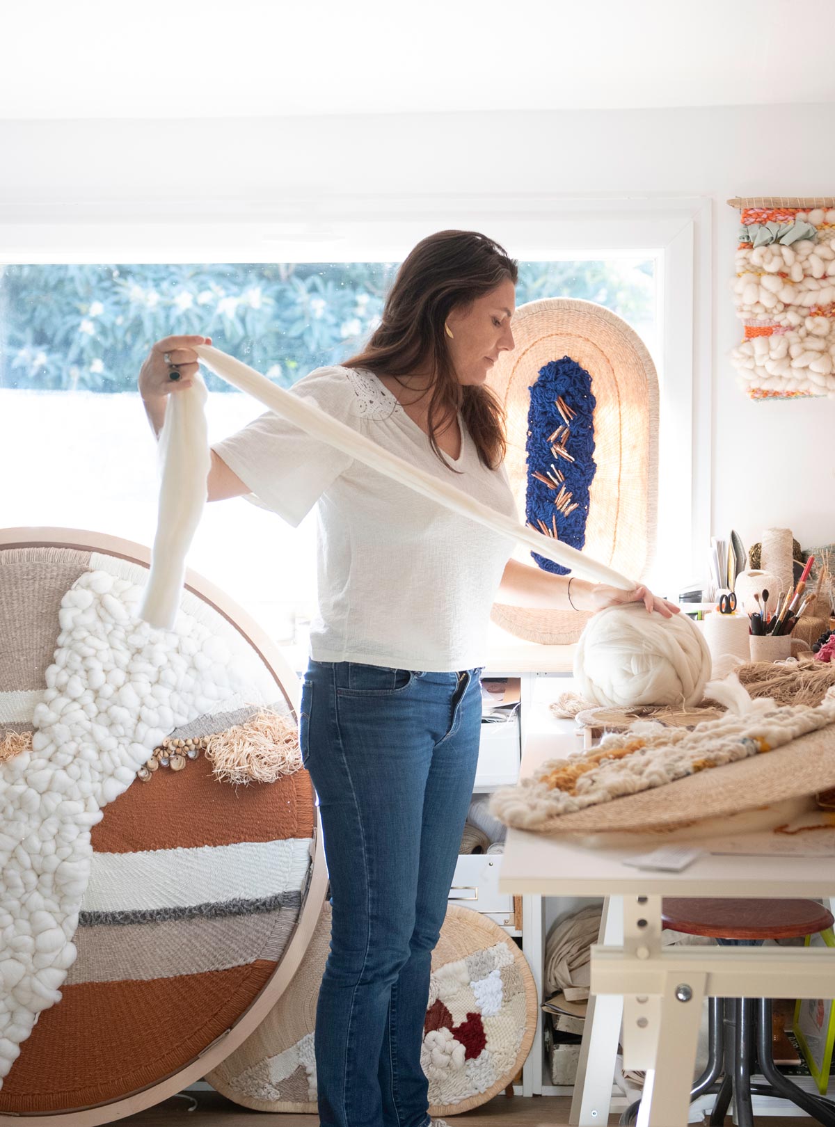 Artiste textile contemporaine, mon travail s’invite à la frontière entre Art, Artisanat et Design. Chaque pièce est pensée comme une présence, qui va communiquer avec son environnement : volume, texture, matière, lumière, circulation, usage et installation.